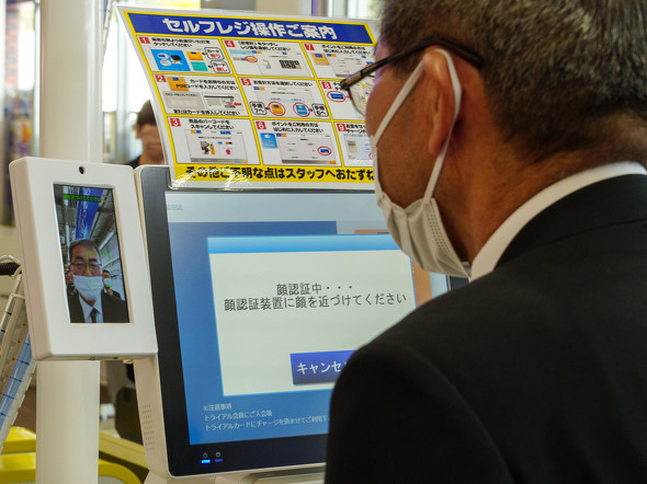 同社が「日本初」としているのが年齢確認も同時に行う顔認証決済の実証実験だ。当面はトライアルの従業員や宮若市関係者のみを対象とした実験だが、手ぶらで購入できる顔認証決済の仕組みを導入した。最初の顔情報登録時に生年月日を確認することで、アルコール飲料購入時に必要な年齢確認も顔認証決済時に同時に行うというもの。これによって、店員を呼び出しての年齢確認が不要になり、セルフレジで24時間アルコール飲料が購入できる。