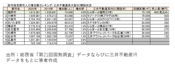 政令指定都市の人口増加数ランキング(20年/15年)と、ららぽーとの運営母体である三井不動産系列の大型商業施設における開設状況をまとめてみました。