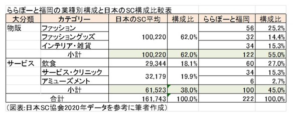 ららぽーと福岡を従来の日本のSCと比較すると、その業種構成に変化が見られます。