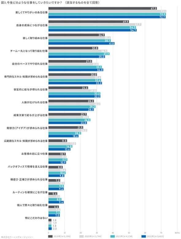 会社でどのような仕事をしていきたいかを聞いた。1位は「楽しくてやりがいのある仕事」(72.7%)、2位は「自身の成長につながる仕事」(54.7%)、3位は「楽しく取り組める仕事」(41.0%)だった。