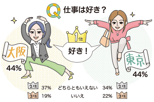 仕事が好きな理由について、大阪は、人情の街を思わせる「人の役に立てる」(21%)が1位に。東京は「仕事内容が楽しい」(35%)といったコメントが多く寄せられた。