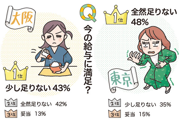 今の給与に対する満足度を聞くと、大阪が「少し足りない」(43%)、東京が「全然足りない」(48%)と、「足りない」派の声が上位に並んだ。「全然足りない」「少し足りない」を合計すると、8割以上が「今の給与では足りない」と感じているようだ。
