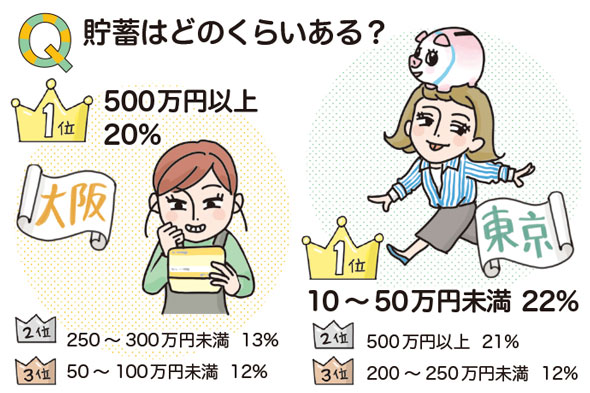 貯蓄額については、大阪の1位が「500万円以上」(20%)だったのに対し、東京は「10万〜50万円未満」(22%)が1位と、大阪と東京で差が見られた。東京は居住費や生活費が高いといわれており、「家賃の支払いなどがある場合、なかなか貯金が貯まらない人も多いのでは」(同社)としている。