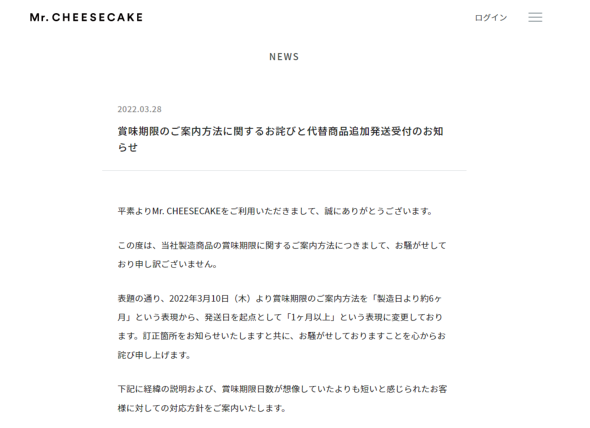賞味期限は製造日から冷凍保存6カ月とWebページ上で説明していながら、顧客の元には製造から4カ月経過したケーキが届いている。当初ミスターチーズケーキ側は、賞味期限は冷凍保存で製造後6カ月という内容に偽りはなく、また製造から何日経ったものを送るかまでは表記していなかったため、問題ないと考えたようだ。