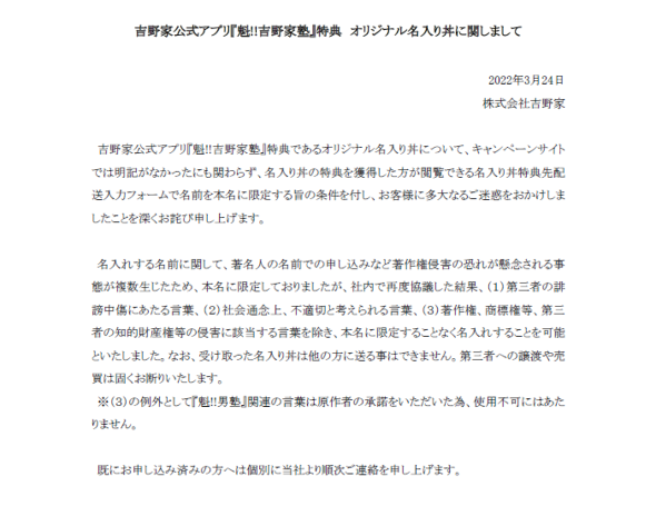 吉野家としては、法に抵触する事態を避けることに力点を置いたのかもしれない。ただ、自社のキャンペーンの表示“制限無く名入れのできる丼をプレゼントする”に対し、消費者がどのように認識するかの配慮が欠けていたことが根本にある。