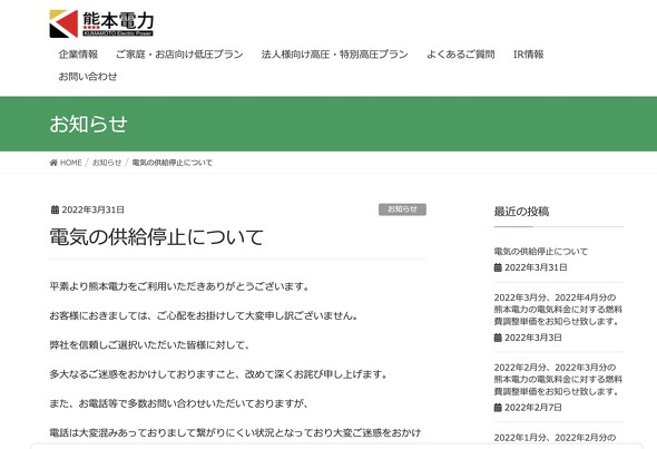 3月31日には、「熊本電力」が電力供給の停止についてWebでアナウンスした。Webでは自身を「電力会社」と称しており、由緒正しそうな印象を受ける。