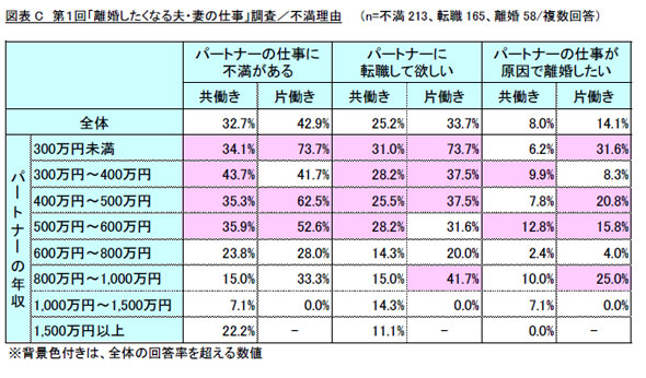 パートナーの年収別にみると、世帯の就業状況にかかわらず、600万円を下回ると仕事への不満や転職を望む割合が高まっている。またパートナーの年収が300万円未満の片働き世帯では、「仕事への不満」(73.7%)、「転職希望」(73.7%)、「離婚意識」(31.6%)が他のカテゴリに比べて突出している。