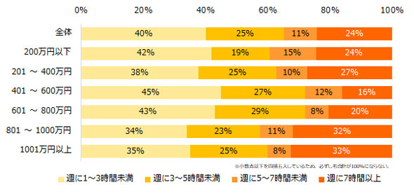 1週間の学習時間は、「週に1〜3時間未満」が40%で最多。「週に7時間以上」の回答が多かったのは、年代別では20代以下と50代以上(27%)、年収別では年収1001万円以上(33%)だった。