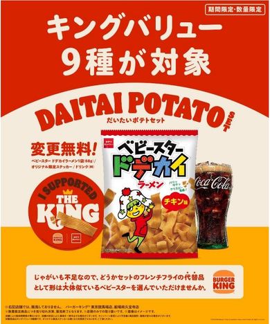 ビーケージャパンホールディングスが運営するハンバーガーチェーンの「バーガーキング」は、5月16日からサイドメニューの「フレンチフライMサイズ」をおやつカンパニーの「ベビースタードデカイラーメン チキン味」に変更できる「DAITAI POTATO SET(だいたいポテトセット)」を発売する。