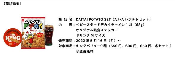 「DAUTAI POTATO SET(だいたいポテトセット)」への変更は、「キングバリュー」(550円、600円、650円の各セット、9種類)の購入時が対象だ。期間・数量限定で提供する。変更は無料で、じゃがいも不足へのサポートの証となる「オリジナル限定ステッカー」も数量限定で配布する。