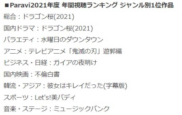 その他、ビジネス・日経部門は『ガイアの夜明け』、国内映画部門では『不倫白書』、韓流・アジア部門では『彼女はキレイだった(字幕版)』、スポーツ部門では『Let's!美バディ』、音楽・ステージ部門では『ミュージックバンク』が1位となった。各部門のランキング詳細は、公式Webサイトで公開している。
