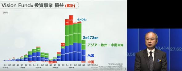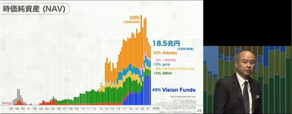 NAVの中心となるソフトバンク・ビジョンファンドの損益は、21年10〜12月期に6兆406億円の利益であったものが、22年1〜3月期には3兆473億円と利益が半減した。「ロシアによるウクライナ侵攻で、株式市場が大きく下落しています。その影響をわれわれのビジョンファンドでも大きく受けました」と孫会長兼社長は説明した。