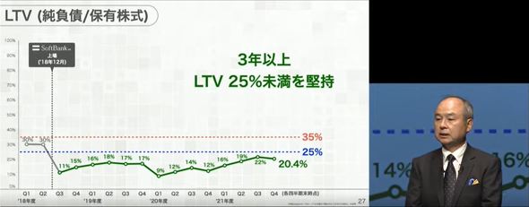 また、孫会長兼社長はLTVについても「安全運転を意識して、実行してきました。その結果、悪化ではなく改善しました」と説明。3年以上続けて25%以下で推移しており、21年10〜12月期に22%であったものが、22年1〜3月期には20.4%と、純負債の割合を減らしたことをアピールした。