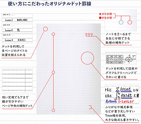 このほかにも、さまざまな使い方ができるわけですが、2分割、3分割する際に時間をかけてはいけません。ノートにはたくさんのドットを上下に設けまして、4分割、5分割にも対応できるようにしました。それだけではなく、定規を使って線を真っすぐ引けるような工夫もしました。