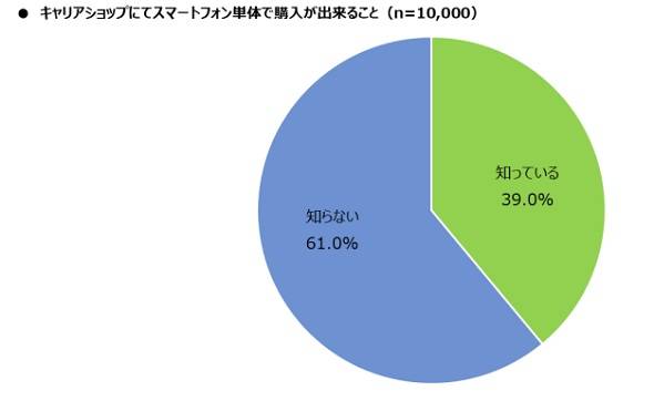 キャリアショップでスマートフォンを単体で購入できることを知っているかの問いに、「知っている」と答えた人は39.0%、「知らない」と答えた人は61.0%と、知らない割合の方が高かった。