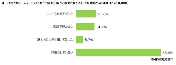 この1カ月で、スマートフォンが「一括1円」などで販売されていることを見聞きしたか尋ねた。最も多かったのは「ニュースを見て知った」で15.7%、次いで 「店舗で見かけた」が14.7%、「友人・知人から聞いて知った」が5.7%と、計31.6%がこの1カ月で見聞きしたことがあった。