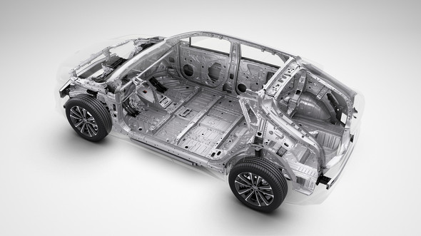 トヨタのBEV、bZ4Xのボディ。骨格がよく分かる画像だ。フロアパネルの下にバッテリーが収まる。トヨタはスバルと共同開発したこのクルマにもEV専用のプラットフォームを開発してクルマの基本性能を高めることに成功している。