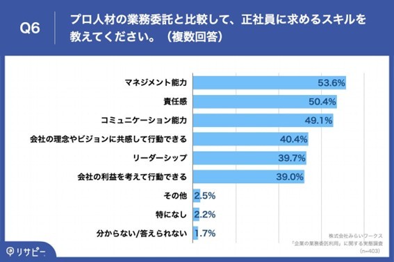 その一方、自社の正社員に求めるスキルとしては「マネジメント能力」(53.6%)、「責任感」(50.4%)、「コミュニケーション能力」(49.1%)が上位を占めた。