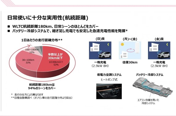 180キロという航続距離については「94%のシーンをカバーする」と日産は言う。1日あたりの走行距離は半数以上が30キロ程度なので、日曜の夜に自宅で充電すれば週末までは充電なしで乗れるというのが、日産の論理だ。