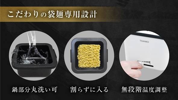本製品はインスタント袋麺専用のラーメン鍋で、袋麺を卓上で熱いまま食べられ、シメまで調理することを可能にした。袋麺がぴったり収まる場所を取らないコンパクトサイズに設計。麺にスープが浸かるので、茹でムラなく調理ができるようにした。