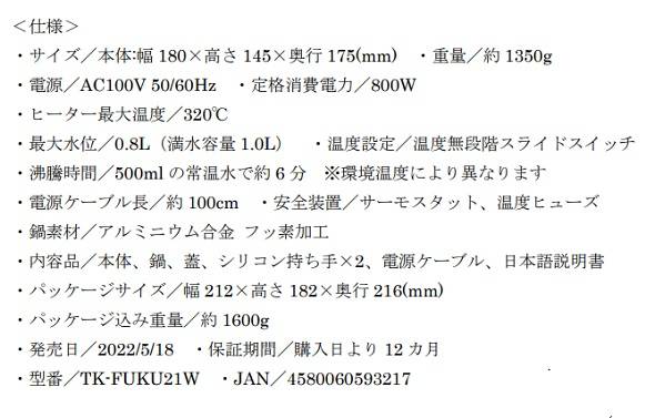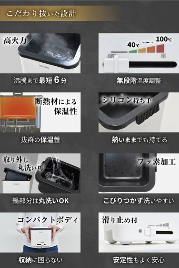 高火力のヒーターを底面の全面に搭載し約6分で500ミリリットルの水を沸騰でき、側面4カ所の断熱材により熱が冷めにくい構造を実現した。前面のスライドスイッチで無段階の火力調整ができ、約40〜100度の温度目安で使用できるようにしている。