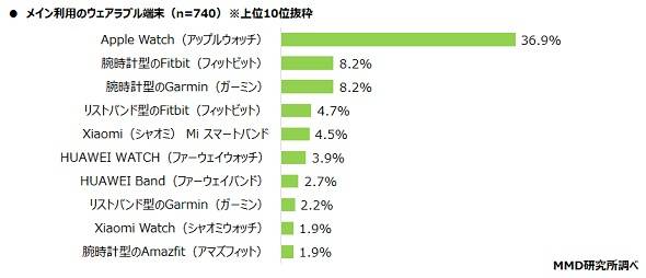 MMD研究所を運営するMMDLabo(東京都港区)は、18〜79歳の男女で「Apple Watch」「スマートウォッチ」「スマートバンド」の利用者を対象に、「ヘルスケアとウェアラブル端末に関する調査」を実施した。メイン利用のウェアラブル端末は何か聞いたところ、最も多かったのは「Apple Watch(アップルウォッチ)」(36.9%)だった。