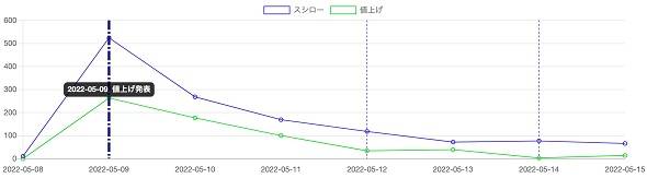 「スシロー」は値上げ記事数・仮想PV・ツイート数では上位だった一方、スシローの記事全体を見ると値上げの話題の割合が大きくなかったことが分かる。値上げを発表したのは事業戦略発表会の場で、同時に「大創業祭」の詳細を発表したり、ゲストに草なぎ剛さんを招待したりしていたため、値上げ以外の話題をメディアに提供していたことが要因のようだ。同じ時期の店舗の一斉休業や、専門店とコラボした担々麺の発売もそれぞれ記事になっていた。