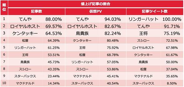また、全記事集計の下位にいる企業が、値上げ記事の割合で上位に来る傾向があった。値上げ発表直後にほかの話題が少なかったことで、値上げ記事の割合が小さな企業との違いを生んだ。