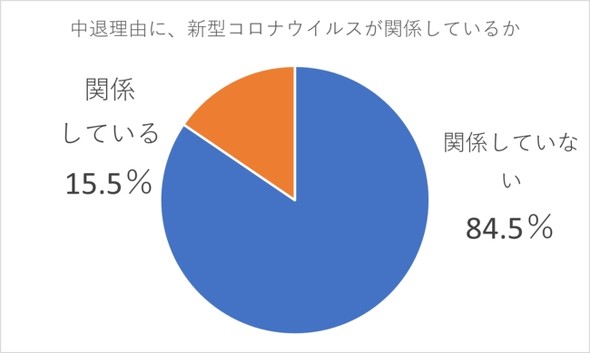 「中退理由に新型コロナウイルスが関係している」と回答した人は15.5%だった。自由記述で募った理由では「オンライン授業では質問がしづらく、授業についていけなくなった」「オンライン授業でモチベーションが保てなくなった」「コロナ禍で、自身や両親の仕事/アルバイトがなくなってしまった」という回答があがった。