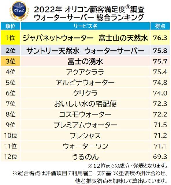 4位以下は「アクアクララ」(75.4点)、「アルピナウォーター」(74.8点)、「クリクラ」(74.0点)、「おいしい水の宅配便」(72.3点)、「コスモウォーター」(72.2点)、「プレミアムウォーター」(71.5点)、「フレシャス」(71.2点)、「ウォーターワン」(71.1点)、「うるのん」(69.3点)だった。