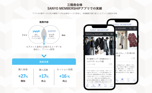 同社はアプリにポイントカードやECなどの機能を持たせていた。そこで、「直近3カ月以内にアプリに来訪し、かつ、SANYO ECで1年間商品を購入をしていない」人を対象にプッシュ通知を配信。アプリ内ECでの購入単価は27%増、購入回数も17%増となった。