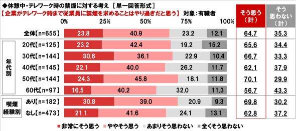 また、企業がテレワーク時まで従業員に禁煙を求めることはやり過ぎだと思うかどうかは、「そう思う」が64.7%で、テレワーク中に企業が干渉することに否定的な意見を持つ人が6割を超えた。