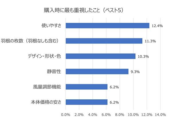 購入時に最も重視したことは、1位が「使いやすさ」で12.1%、2位は「羽根の枚数(羽根なしも含む)」で11.3%、3位は「デザイン・形状・色」で10.3%だった。
