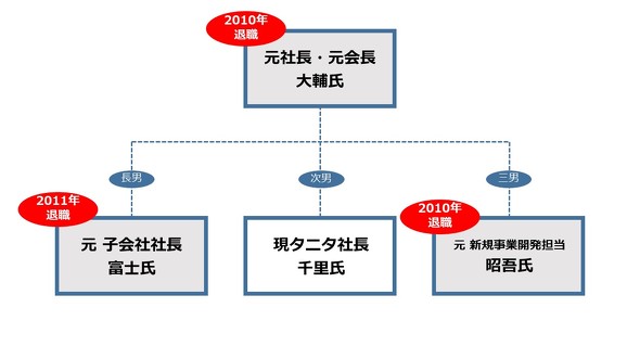 そして長兄の富士氏は、タニタ子会社の社長としてフィットネス事業を手掛けていたが、千里氏より出勤停止処分が下り、千里氏の社長就任から3年後に退社している。
