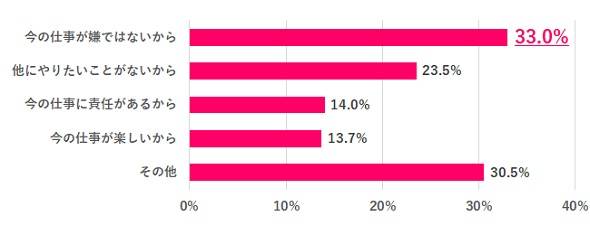 今の仕事を「辞めない」と答えた人に理由を聞いた。1位は「今の仕事が嫌ではないから」(33.0%)、2位は「他にやりたいことがないから」(23.5%)、3位は「今の仕事に責任があるから」(14.0%)となった。「嫌ではない」「やりたいことがない」など、「現状維持や消去法的に今の仕事を続けるという人が多いようだ」(キャリアデザインセンター)。