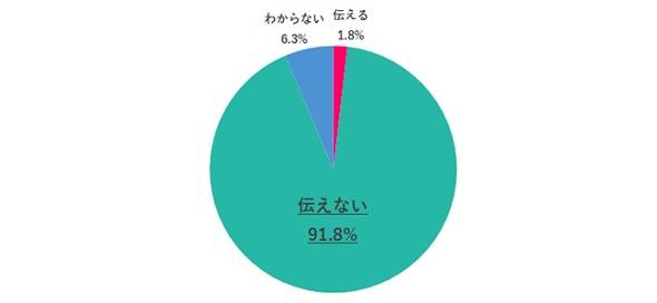 宝くじが当たり会社を辞めることになった場合、退職理由を正直に職場の人に伝えるかの問いに、91.8%が「伝えない」と回答。大多数が宝くじが当たったことは隠したいと考えていることがうかがえた。