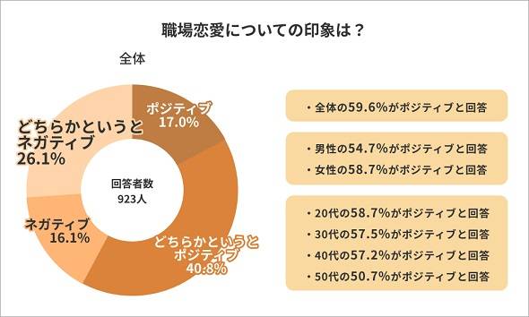 職場恋愛についての印象を尋ねた。「ポジティブ」(17.0%)、「どちらかといえばポジティブ」(40.8%)を合わせた半数以上の57.8%が「ポジティブ派」と回答。属性別でも、男女別及び全年代で「ポジティブ派」の回答が過半数を占めた。年代別では、「ポジティブ派」の回答で最も多かったのは20代で58.7%、最も低かったのは50代で50.7%だった。