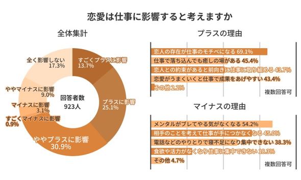 プラスに影響する理由としては「恋人の存在が仕事のモチベーションになる」が69.1%で最多だった。マイナスに影響する理由のトップは「メンタルがブレてやる気がなくなる」(54.2%)となった。