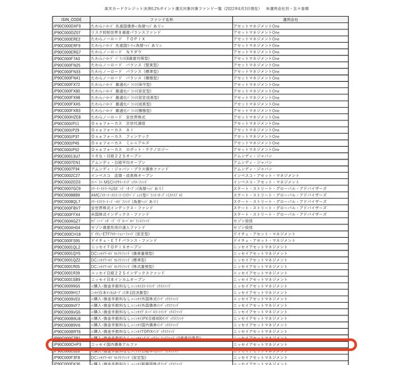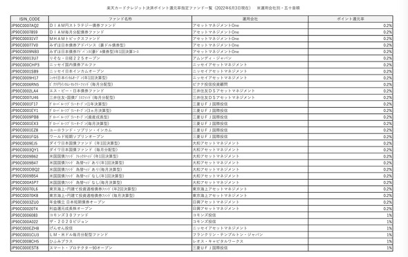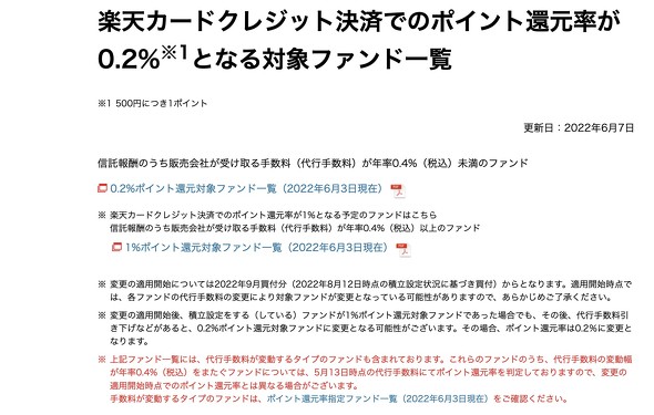 なお、代行手数料が変動する投信については、「楽天カードクレジット決済ポイント還元率指定ファンド一覧(2022年6月3日現在)」(PDF)というリストで公開しており、現時点の還元率も公表している。