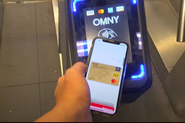 これは米ニューヨークの地下鉄改札口。当時、Apple Payに登録していた日本発行のMastercardのカードは、海外だとNFCによるタッチ決済になったので、そのままApple Payで利用できた。現状はVisaも含めて日本でもクレジットカードのタッチ決済に対応している日本のSuicaなどの交通系ICとできることは変わらない。しかし海外で利用しクレジットカードでタッチして乗車することに慣れた外国人は、当然日本でも利用したい。クレジットカードなので、現地通貨を必要とせず公共交通機関に乗れる。訪日外国人が、Suicaを買ってチャージすることを考えるとやはりクレジットカードの方が利便性は高い。