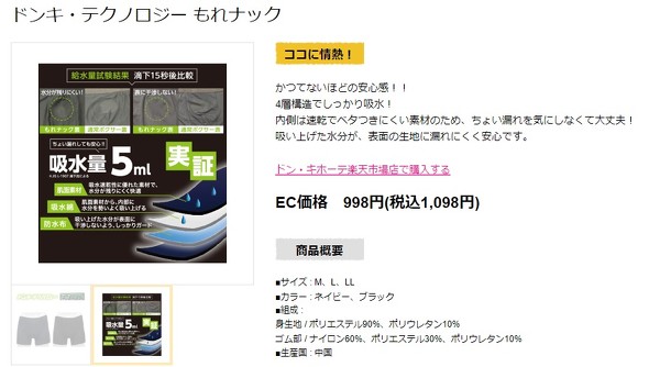 ちょっと面白い売れ方をしているのが「もれナック」だ。この商品は、尿漏れの悩みを抱える人のために開発された。4層構造で、しっかり吸水できるようにしているのが特徴だ。内側はすぐに乾いてベタつきにくくしている。