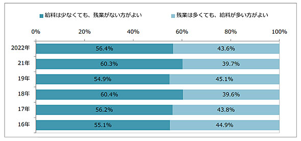 「調査開始の12年から18年までは毎年『給与は少なくても、残業がないほうがよい』の回答が増加していたが、ここ数年は傾向がつかみにくくなっている」(同社)