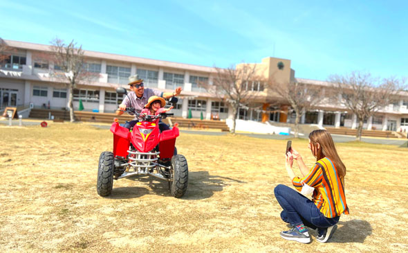 屋外では、グラウンドだった広い芝生スペースを活用したバギー体験も可能。普通自動車免許を持っている人であれば、バギーに乗ることもできる。