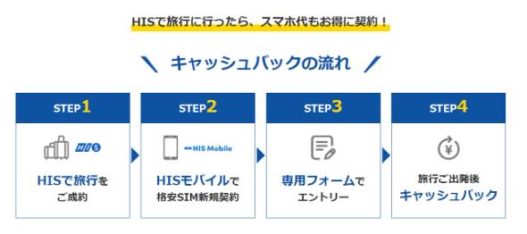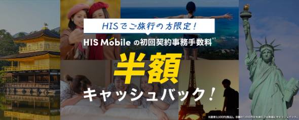 対象者は、「HIS Mobile」の初回契約事務手数料(通常3300円)の半額(1650円分)が、旅行出発後にキャッシュバックされる。キャッシュバックは、旅行の出発かつHIS Mobileの新規プラン開通が条件となり、双方を満たした月の翌月末頃にメールでの案内となる。