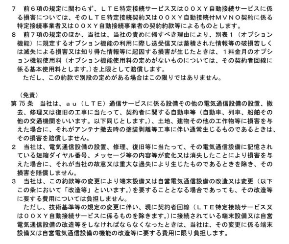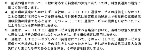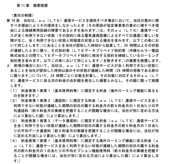 KDDIの「au(LTE)通信サービス契約約款」には、「au(LTE)通信サービスが全く利用できない状態(その契約に係る電気通信設備によるすべての通信に著しい支障が生じ、全く利用できない状態と同程度の状態となる場合を含みます。以下この条において同じとします。)にあることを当社が認知した時刻から起算して、24時間以上その状態が連続したときに限り」、契約者に損害を賠償するとある。