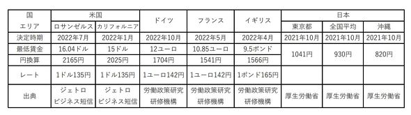 最低賃金法は日本だけではなく、諸外国にもある。その水準は、その国の経済力を示すと考えられる。22年6月時点で確認された米国、ドイツ、フランス、英国、日本の最低賃金を比較してみた(同年6月時点のレートで円に換算)。