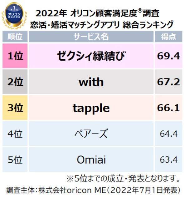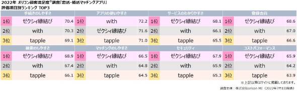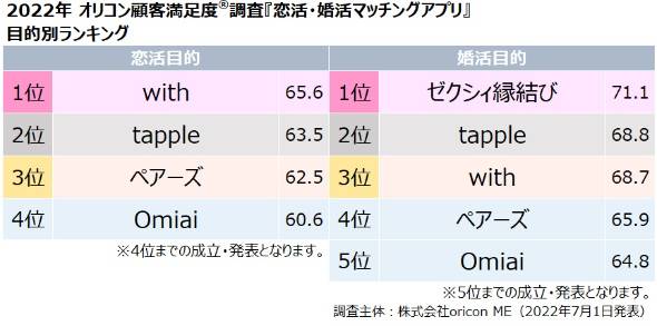 新設された目的別の「恋活目的」部門は「いずれは結婚したいが、現時点では恋人を見つけたいと考えている(いた)、もしくは結婚するつもりはない(恋人を見つけたい)と考えている(いた)人」を対象とし、「with」が1位を獲得。一方で、「婚活目的」部門は「3年以内に結婚したいと考えている(いた)人」を対象とし、「ゼクシィ縁結び」が1位となった。