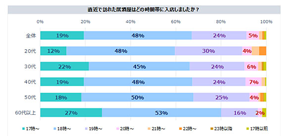 居酒屋には何時くらいに入店している人が多いのだろうか。この質問に対して、「18時〜」(48%)と答えた人が半数ほど。「17時〜」(19%)、「19時〜」(24%)を合わせると、17〜19時に入店している人が91%を占める結果に。前回の調査結果をみると、17〜19時台が94%だったことを考えると、利用時間に大きな変化はないことがうかがえた。