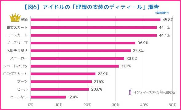 「アイドルの理想の衣装系統」について調査したところ、1位は「可愛い系衣装」で 65.9%だった。2位は「清楚系衣装」(56.7%)、3位は「クール系衣装」(32.8%)だった。一方で「セクシー系衣装」は22.6%となり、露出が多い衣装はそれほど人気がない結果となった。