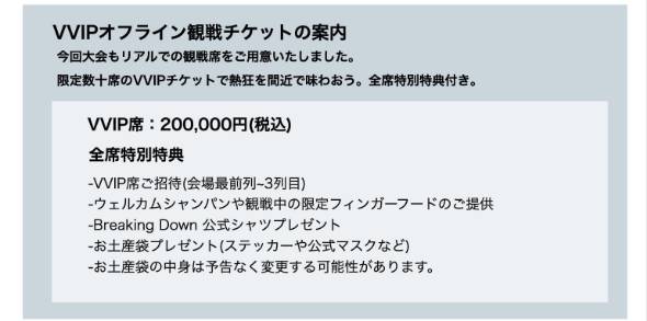 一方のオフライン観戦チケットは、限定数十席を用意し価格は20万円に設定している。